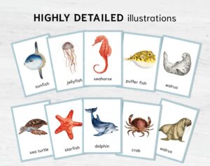 Sea Animal Flashcards for Montessori Learning – Educational Homeschool Resource, Watercolor Nomenclature Cards